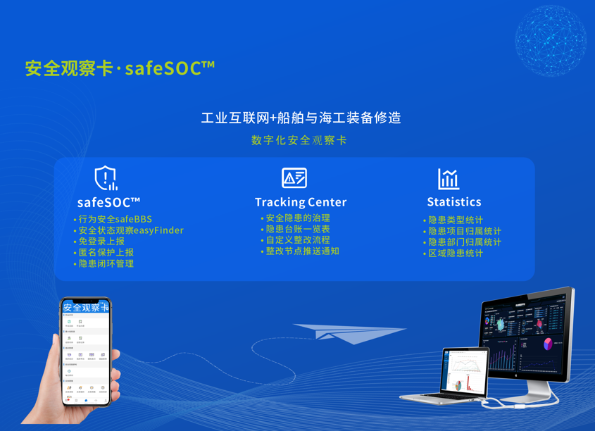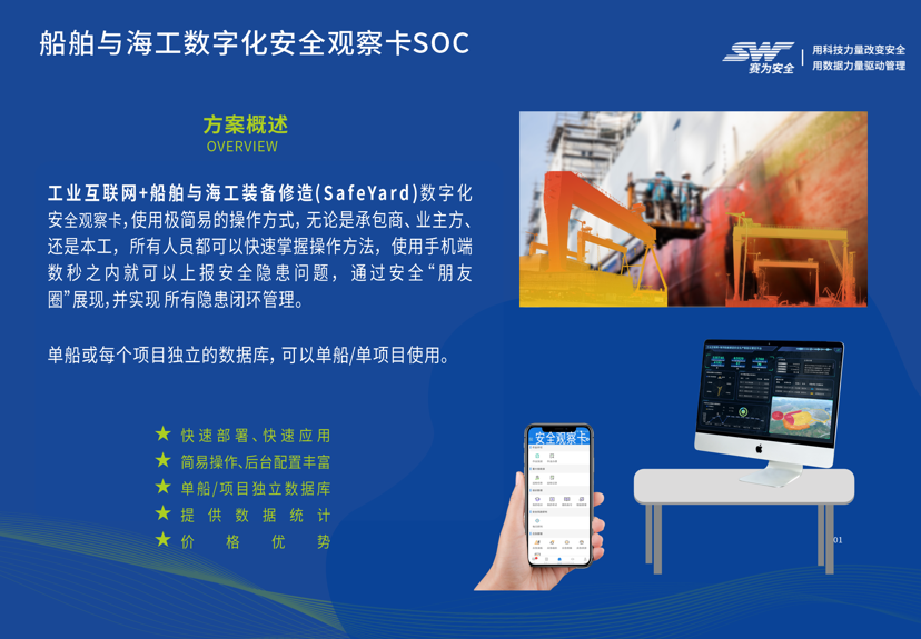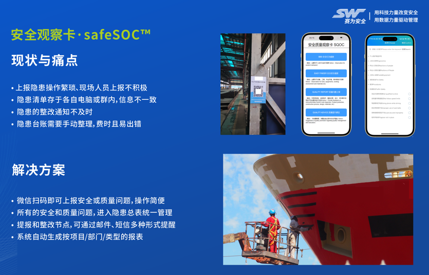 賽為安全公司獨立自主開發(fā)的“賽安·安全觀察卡 safeSOC”,可以進行人員行為安全觀察、設(shè)備、物料和環(huán)境的安全狀態(tài)觀察,極簡易的操作方式,業(yè)主、本工、承包商通過手機掃碼,可以在數(shù)秒內(nèi)上報隱患,可后續(xù)進行閉環(huán)跟進管理,降低或杜絕船艙等受限空間事故的發(fā)生。